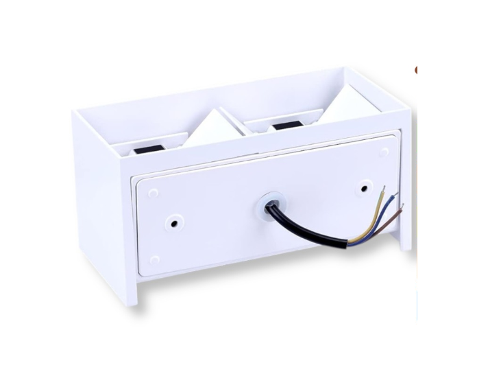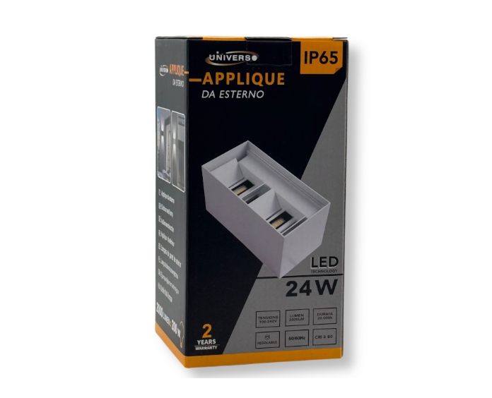 lampada da muro con potenza di 24W e corpo illuminante integrato. Dotata di una doppia sorgente luminosa con tecnologia LED SMD, la sua elegante forma rettangolare è realizzata in alluminio di colorebianco. Con doppio fascio luminoso regolabile e flusso luminoso di 2000 lm, questa wall light ad alta luminosità ha un rapporto di 83 lm/W. Grazie al suo grado di protezione IP65, risulta ideale perun utilizzo esterno anche sotto la pioggia prolungata. Il driver è già inserito all'interno della lampada, che necessita solo di essere collegata alla rete elettrica.