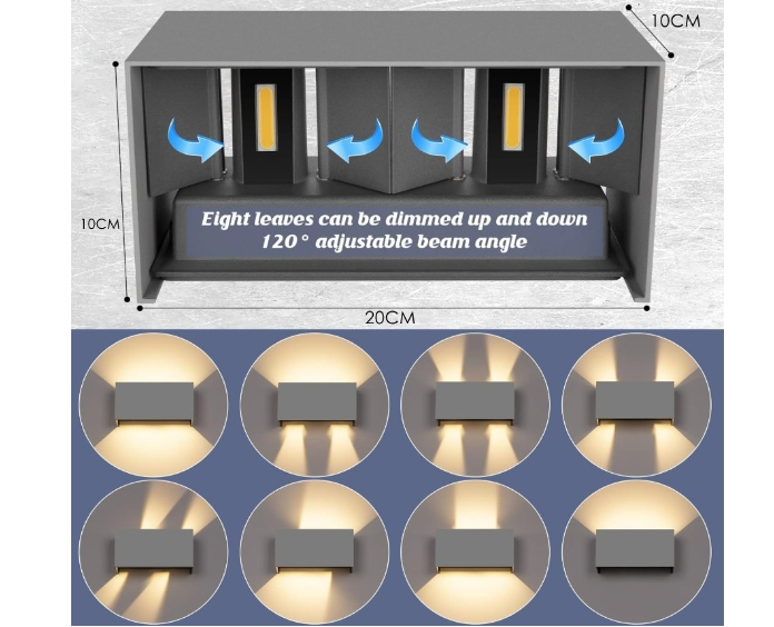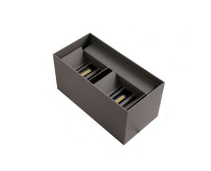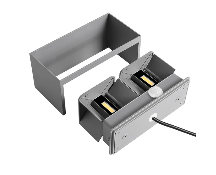 lampada da muro con potenza di 24W e corpo illuminante integrato. Dotata di una doppia sorgente luminosa con tecnologia LED SMD, la sua elegante forma rettangolare è realizzata in alluminio di coloregrigio. Con doppio fascio luminoso regolabile e flusso luminoso di 2000 lm, questa wall light ad alta luminosità ha un rapporto di 83 lm/W. Grazie al suo grado di protezione IP65, risulta ideale perun utilizzo esterno anche sotto la pioggia prolungata. Il driver è già inserito all'interno della lampada, che necessita solo di essere collegata alla rete elettrica.