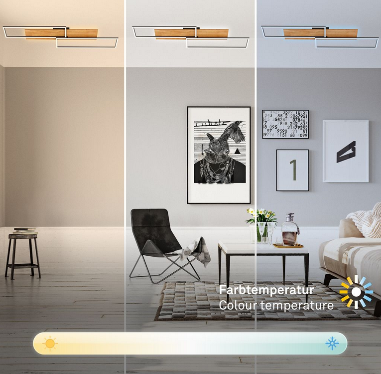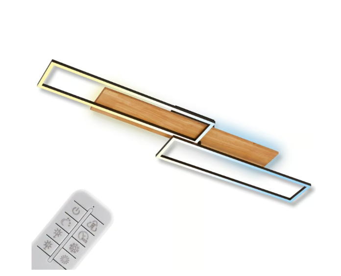 Regolazione flessibile della luce: dotata di un pannello LED da 37,5W che eroga 4100 lumen, questa lampada da soggiorno offre una temperatura di colore regolabile da bianco caldo (3000K) a bianco luce diurna (6500K), ideale per le diverse esigenze di illuminazione. Elegante design in legno: la combinazione di metallo nero e legno conferisce a questa plafoniera un aspetto moderno ma caldo, adatto a vari stili di interni. Dimmerabilità e retroilluminazione: la plafoniera da cucina è dimmerabile all'infinito e dispone di una retroilluminazione aggiuntiva per un'illuminazione d'atmosfera, entrambe controllabili tramite telecomando.