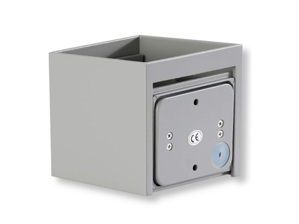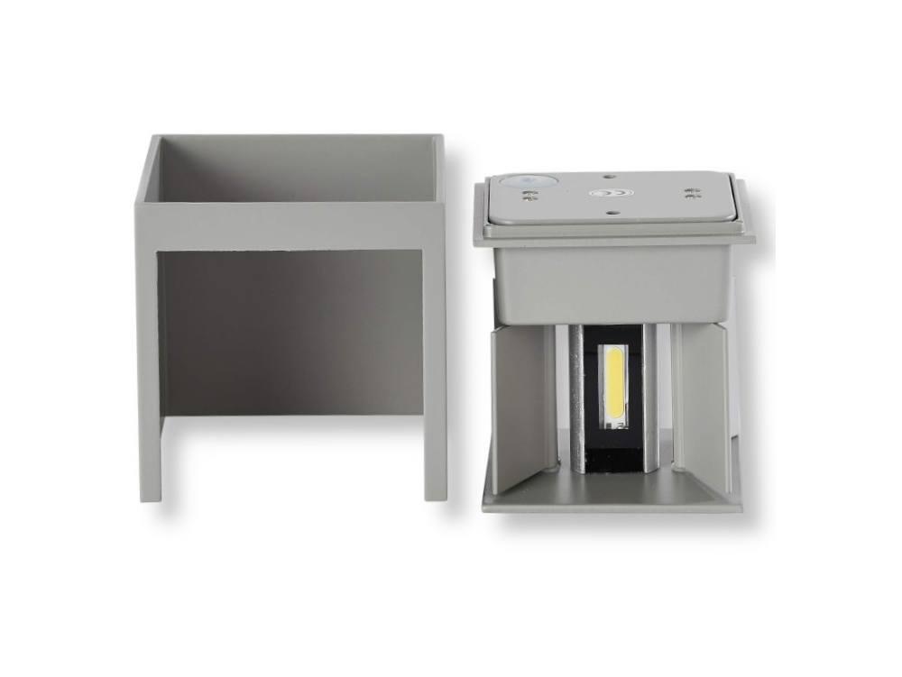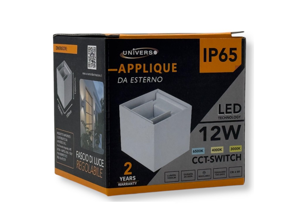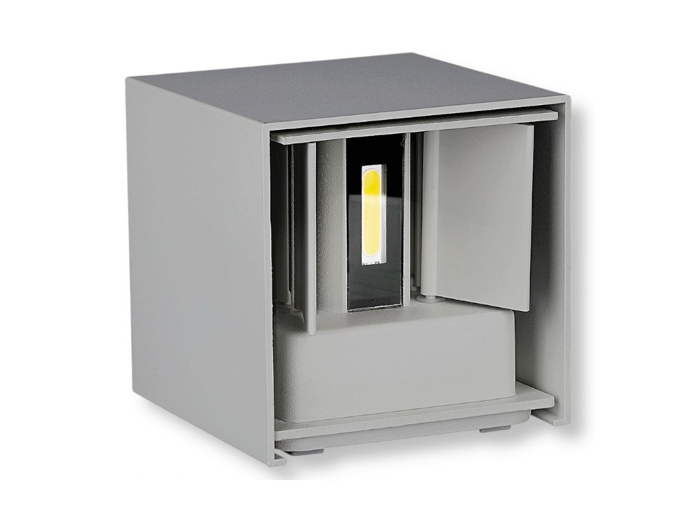 Applique con corpo illuminante LED da 12W integrato e tecnologia LED SMD. Doppia sorgente luminosa con copertura trasparente ed alette regolabili. Forma cubica di design realizzata in metallo di colore grigio. Fascio luminoso regolabile e flusso luminoso di 1000lm. Alta luminosità e rapporto di 83 lm/W. Grado di protezione IP65 per utilizzo esterno. Tramite selettore è possibile scegliere tra 3 temperature colore: bianco caldo 3000K, naturale 4000K e freddo 6500K. Classe energetica F. Dimensioni: 100x100x100mm.