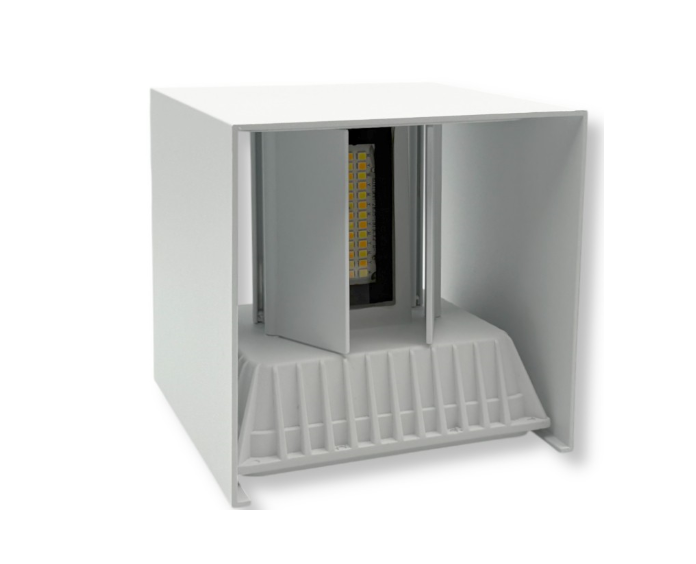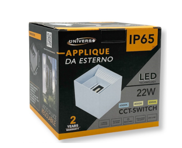 Universo ES66-B3C è una lampada da muro con potenza di 22W e corpo illuminante integrato. È dotata di una doppia sorgente luminosa con tecnologia LED SMD rivestita da una copertura trasparente. La sua elegante forma cubica è realizzata in alluminio di colore bianco. Con fascio luminoso regolabile e flusso luminoso di 2000 lm, questa wall light ad alta luminosità ha un rapporto di 90 lm/W. Sono inoltre presenti due alette per ciascuna sorgente che permettono di regolare e direzionare facilmente il fascio luminoso. Grazie al suo grado di protezione IP65, risulta ideale per un utilizzo esterno anche sotto la pioggia prolungata. Il driver è già inserito all'interno della lampada, che necessita solo di essere collegata alla rete elettrica. Nella confezione riceverete le viti per il fissaggio amuro, una chiave a brugola ed un morsetto a viti per il collegamento dei cavi.