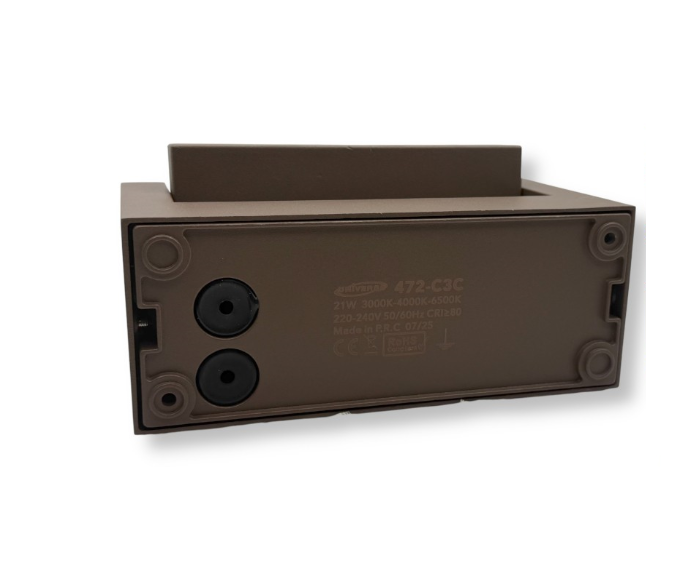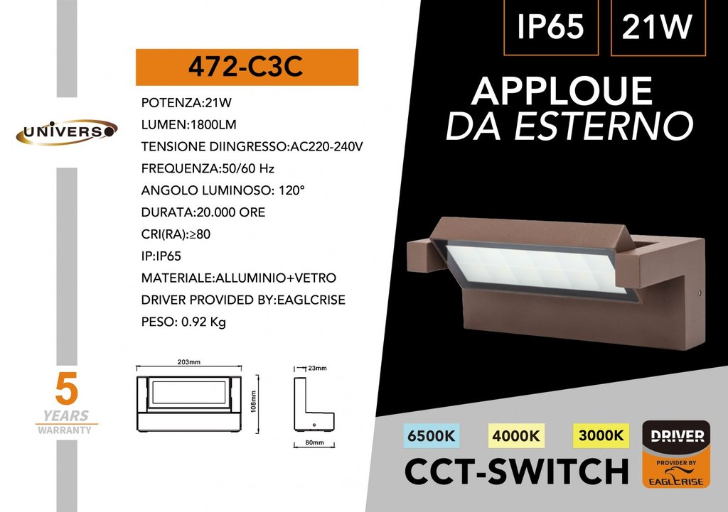 Universo 472-C3C è una lampada LED da 21W di potenza con tecnologia LED SMD. Il suo corpo è realizzato in alluminio di colore colore bronzo (rosso ruggine), mentre la sua copertura è opaca. Con fascio luminoso di 120° e flusso luminoso di 1800 lm, questa lampada ad alta luminosità ha un rapporto di 85 lm/W. È predisposta per l'installazione a parete.