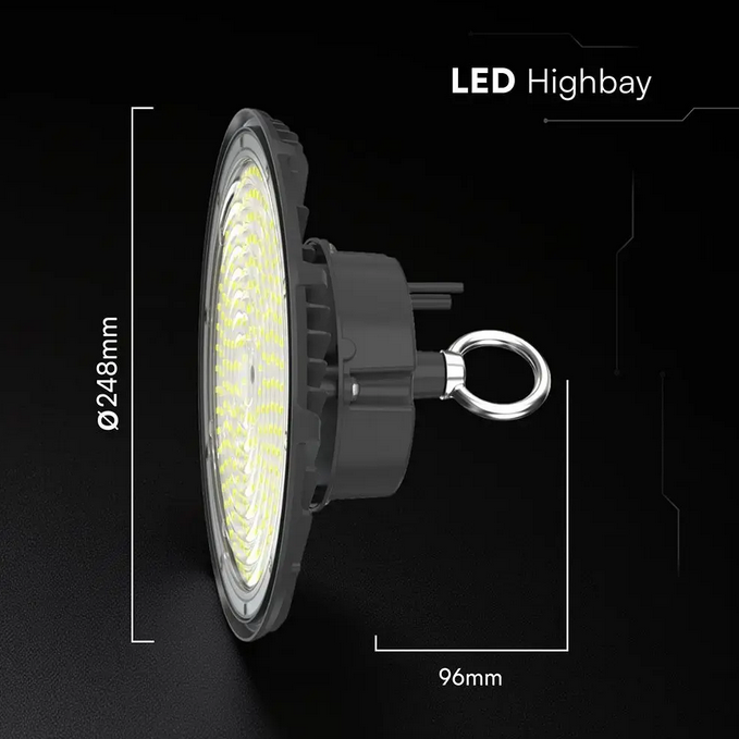 Potenza 150W con efficienza luminosa 160 lm/W Luce fredda 6500K per visibilità ottimale Flusso luminoso circa 24.000 lm Design UFO compatto per copertura ampia dell’area Corpo nero con protezione IP65 contro polvere e acqua Installazione semplice con gancio o catena