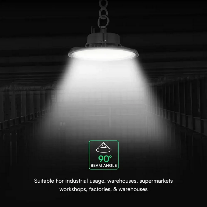 Potenza 200W con efficienza luminosa 160 lm/W Luce fredda 6500K per massima visibilità Flusso luminoso 32.000 lm Design UFO compatto per distribuzione luminosa ampia Corpo robusto nero con protezione IP65 Installazione facile con gancio o catena Ottima scelta per capannoni industriali, magazzini e aree tecniche
