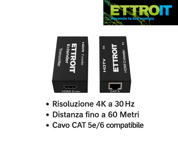 L’estensore EXTENDER HDMI ETTROIT ET5003 permette di trasmettere segnali video in qualità 4K Ultra HD fino a 60 metri su semplice cavo di rete CAT5e/CAT6. Compatto, efficiente e pronto all’uso, è ideale per collegamenti a lunga distanza tra dispositivi HDMI in ambito professionale e domestico.