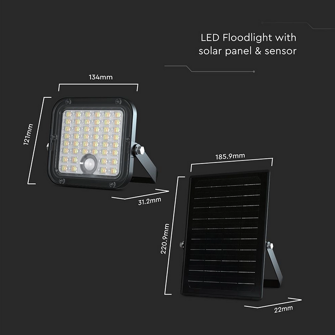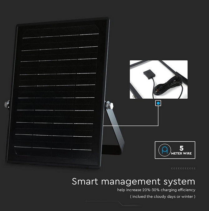 Garanzia 2 anni Colore della Luce 2in1 (4000K + 6000K) Flusso Luminoso 1500 lm Chip LED V-TAC Forma Rettangolare Dimmerabile Sì (Controllo remoto) Grado di Protezione IP65 Materiale ABS + PC Colore Nero CRI >80 Fascio Luminoso 120° Numero di LED 88 Lunghezza Cavo 500 cm Tensione di Alimentazione AC:220-240 V Tipo LED SMD Gradi di Inclinazione 60° Dimensioni Pannello Solare 202x220 mm Posizione Pannello Solare Separato Montaggio Pannello Solare A Parete Connettore Pannello Solare Jack Potenza Pannello Solare 4.5 W Tipo Sensore PIR (Sensore di Movimento) Angolo di Rilevamento 120° Tipo Batteria LFP (Litio-Ferro-Fosfato) Capacità Batteria 3600 mAh Tensione della Batteria 3.6 V Autonomia Fino a 60 ore Tempo di Ricarica 6 ore Batteria Inclusa Sì Modo Ricarica Pannello Solare Tipo di Installazione Superficie Portata del Segnale 6 m (Telecomando)