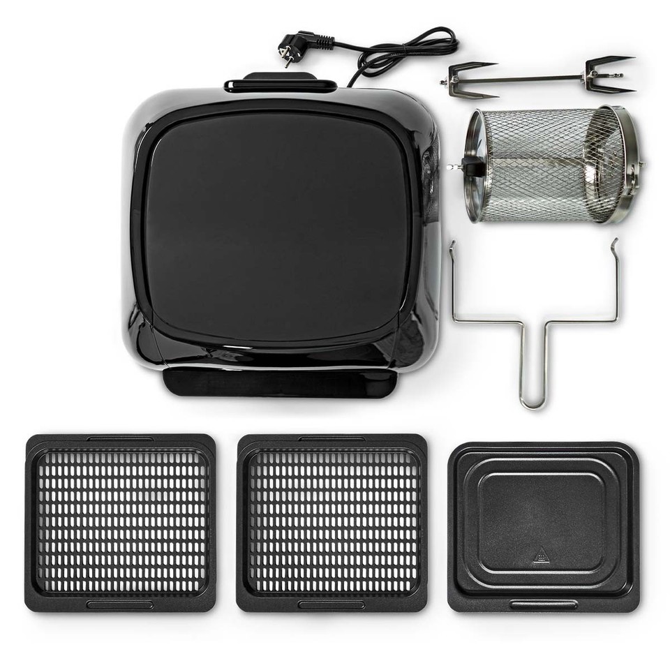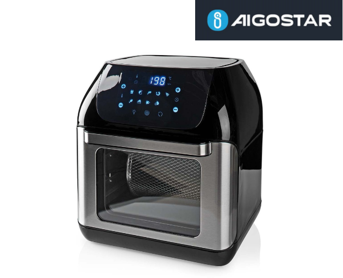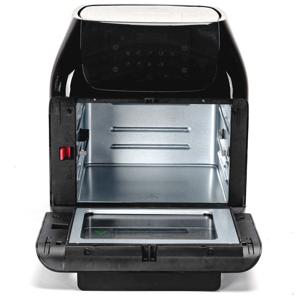 Caratteristiche principali: Pannello LED touch HD; 9 menù preimpostati; Funzione rotante per arrostire polli interi; Pentola interna in alluminio per uso alimentare; Con finestra di visualizzazione e illuminazione interna; Vari tipi di accessori per soddisfare le diverse esigenze di cottura di ingredienti differenti Modello Friggitrice ad aria multifunzione 12L Potenza 1500W Capacità12 litri Voltaggio 220-240V~ 50/60Hz Timer 90 minuti Temperatura 65 – 200 °C Programmi 9 preimpostati Dimensioni 336 × 336 × 368 mm Peso netto 6,5 kg Materiali Alluminio + ABS Colore Nero Accessori inclusi 2 griglie, piastra raccogli-olio, spiedo per pollo, supporto girarrosto, cestello rotante Sicurezza Protezione dal surriscaldamento, spegnimento automatico all’apertura porta