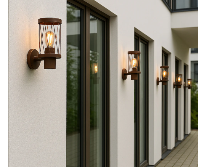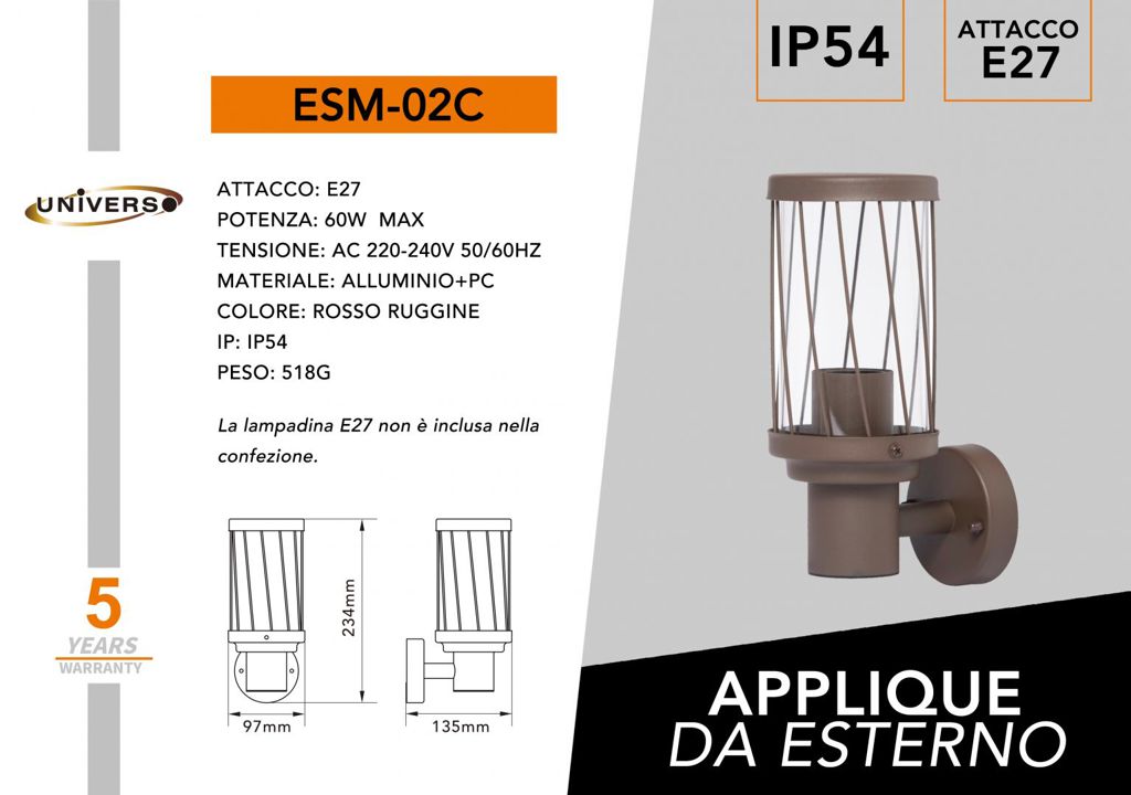 Alimentazione AC 220-240V Frequenza 50/60Hz Potenza 60W Max Attacco lampada 1x E27 (lampadina non inclusa) Compatibilità lampadine LED / alogene Materiale struttura Alluminio verniciato Colore finitura Rosso ruggine Materiale diffusore Polietilene trasparente con dettagli in alluminio incrociato Grado di protezione IP54 (resistente a polvere e spruzzi d’acqua) Installazione A parete, peresterni Applicazioni consigliate Facciate, ingressi, terrazze, balconi, giardini, vialetti Stile Moderno, decorativo, scenografico Dimensioni 234mm x 135mm x 97mm Peso 518 gr