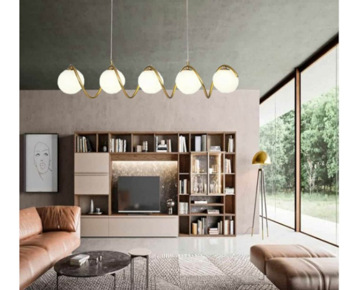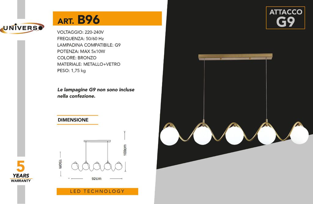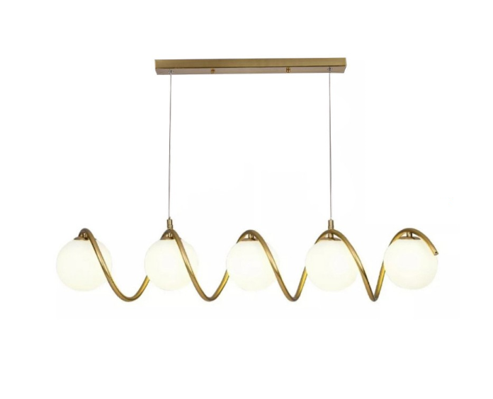 Tipo di attacco: G9 (lampadine non incluse) Tensione di ingresso: 220-240V 50/60Hz Colore: Bronzo Dimensioni: 100x92 cm Materiale: Metallo + Vetro Peso: 1.750 gr La combinazione della struttura ondulata in bronzo e del paralume in vetro opaco rende questo lampadario a sospensione davvero eccezionale. Questa lampada a 5 luci aggiunge un fascino ultra moderno al tuo spazio. Ideale per Illumina la tua isola della cucina, il tavolo della sala da pranzo, il soggiorno e altro ancora con la luce ambientale. La lampada viene fornito senza lampadina, per ogni sfera va utilizzata la lampadina con attacco G9