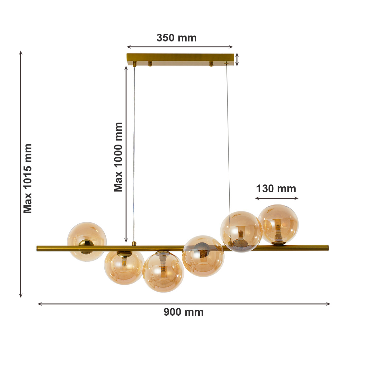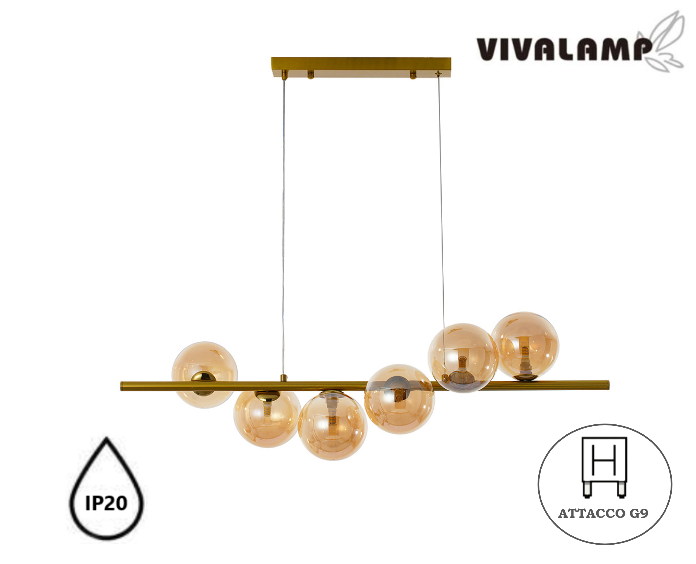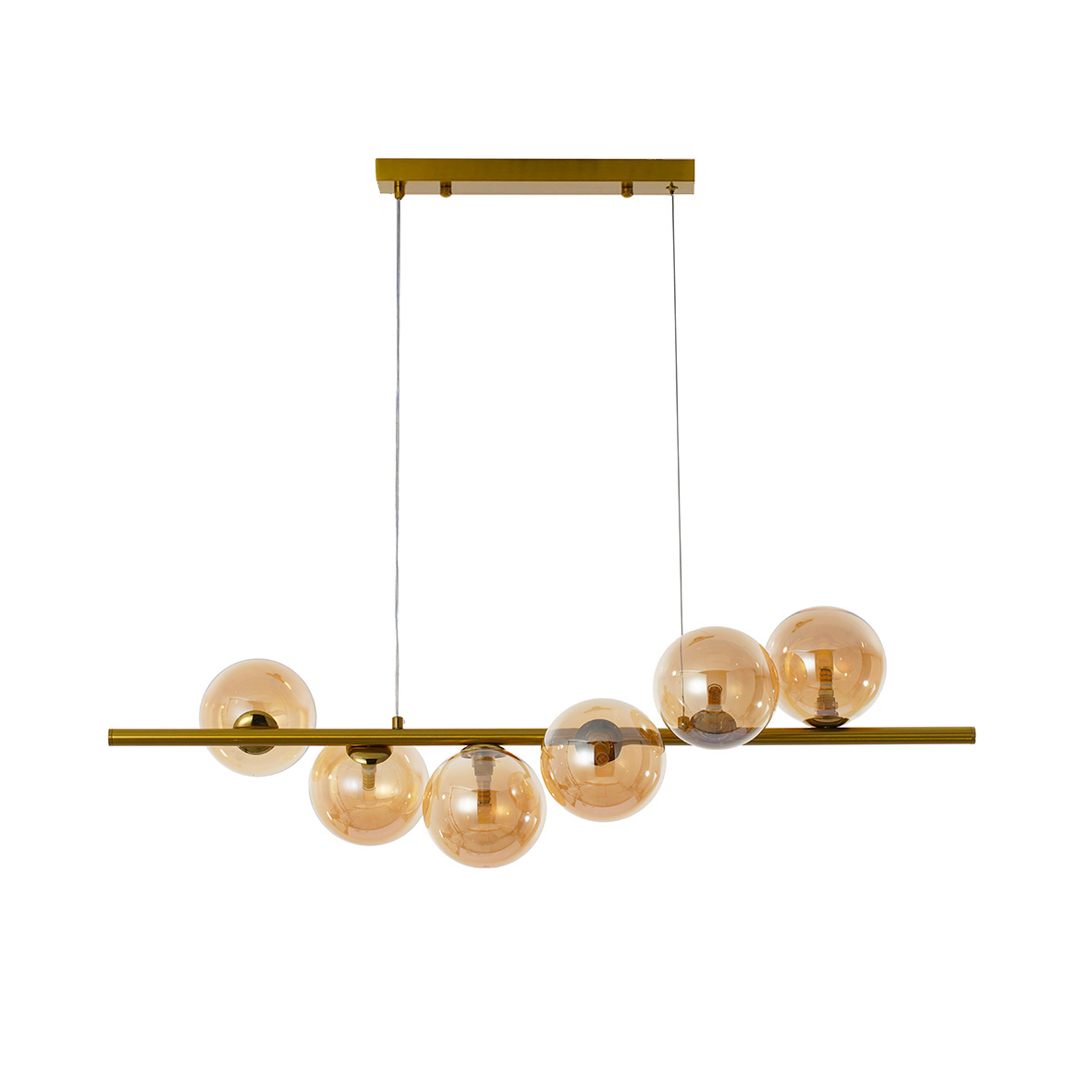 Lampadario a sospensione con sfere in vetro specchio ambrato, è un oggetto di design moderno ed elegante. Le sei sfere in vetro trasparente sono di misura uniforme, questo rende armonioso e regolare,la diffusione della luce in tutto l’ambiente a 360 gradi.