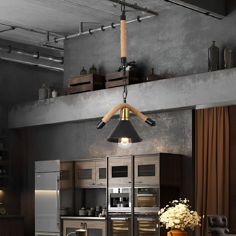 Lampadario a sospensione dal design rustico con corda in canapa perfetto per arredare casa con originalit?. Dotato di 1 portalampada con paralume a forma di campana con attacco E27, perfetto per casa, tavernette, bar, pub e ristoranti.