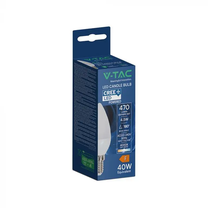 Potenza 4.5W – equivalente a circa 40W Flusso 470lm, luce 3000K, fascio 180° Chip LED CREE, CRI >80 Attacco E14, forma Candela, corpo in termoplastica bianca Durata stimata 20 000 ore, cicli ON/OFF >20 000, grado protezione IP20