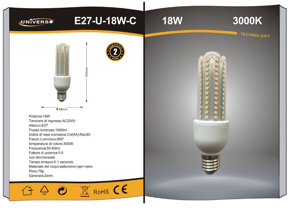 Lampadina Tubo LED 18W Attacco E27 Luce Calda 3000K