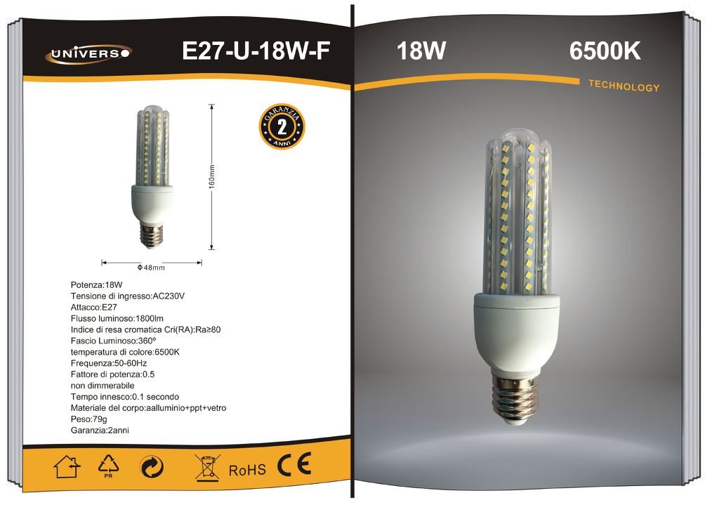 Lampadina Tubo LED 18W Attacco E27 Luce Fredda 6500K