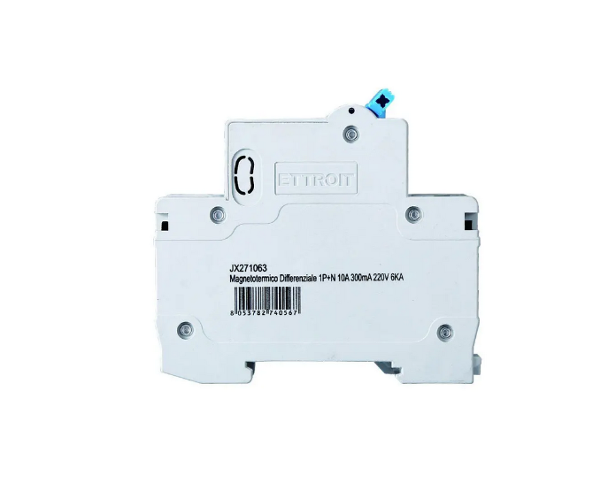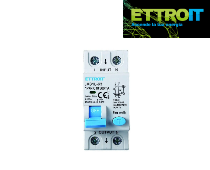 Interruttore Magnetotermico Differenziale di protezione elettrica progettato per garantire la sicurezza di un impianto elettrico. Ecco un riepilogo delle sue principali caratteristiche e specifiche:~| Marca e Modello: ETTROIT, JXB1L-63-1P+N-10A-6KA-300mA Tipo di Interruttore: Magnetotermico Differenziale Numero di Poli: 1P+N (1 polo più neutro) Corrente Nominale: 10A Potere di Interruzione Nominale: 6000A (6kA) Sensibilità del Differenziale (Corrente Nominale Differenziale di Intervento): 300mA Tensione Nominale: 240V sinusoidale Spazio Occupato: 2 moduli DIN Protezione Offerta: Magnetica: Protegge contro i cortocircuiti. Termica: Protegge contro i sovraccarichi. Differenziale: Protegge contro le correnti di dispersione verso terra.