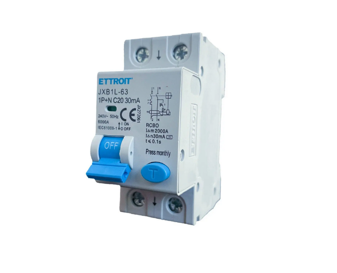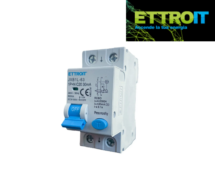 Marca e Modello: ETTROIT, JXB1L-63-1P+N-20A-6KA-30mA Tipo di Interruttore: Magnetotermico differenziale Configurazione Poli: 1P+N (1 Polo + Neutro) Corrente Nominale: 20A Potere di Interruzione Nominale: 6000A (6kA) Corrente Nominale Differenziale di Intervento: 30mA (Sensibilità del differenziale) Tensione Nominale Sinusoidale: 240V Occupazione Moduli DIN: 2 moduli