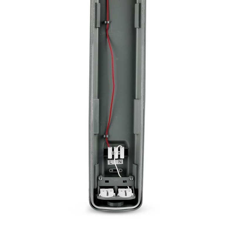 Tensione / Frequenza: 230V, AC:200-240V, 50/60Hz Tipo di collegamento: morsetti a vite Potenza: 2x18W Colore della luce: bianco freddo (6400K) Potenza (equivalente ad incandescenza): ~ 72W Flusso luminoso: 3.400Lm - 94LM/W Apertura fascio luminoso: 120° Corpo Materiale: plastica ABS/PC (Corpo-Diffusore in plastica) Classe di protezione: waterproof IP65 Dimensioni: 1260 x 112 x 63 mm Classe energetica: A+ Colore: grigio Dimmerabilità: NO Vita media: 20.000h CRI: >80 PF: >0.5