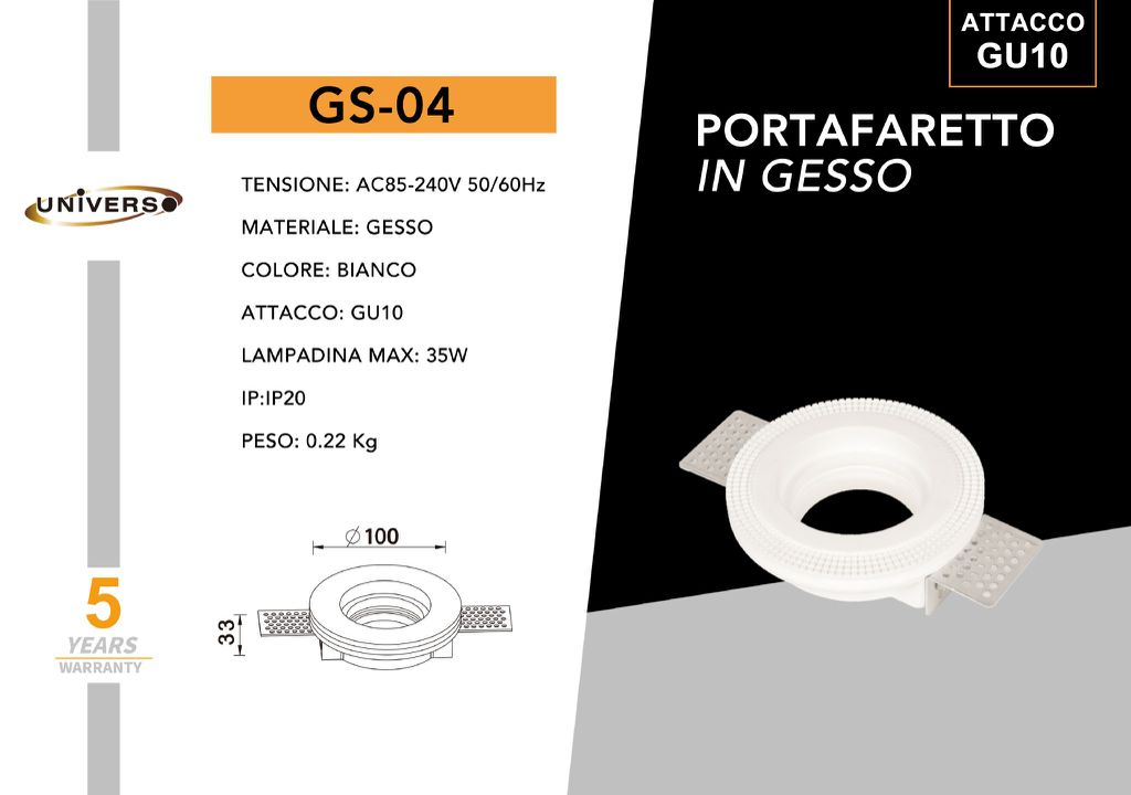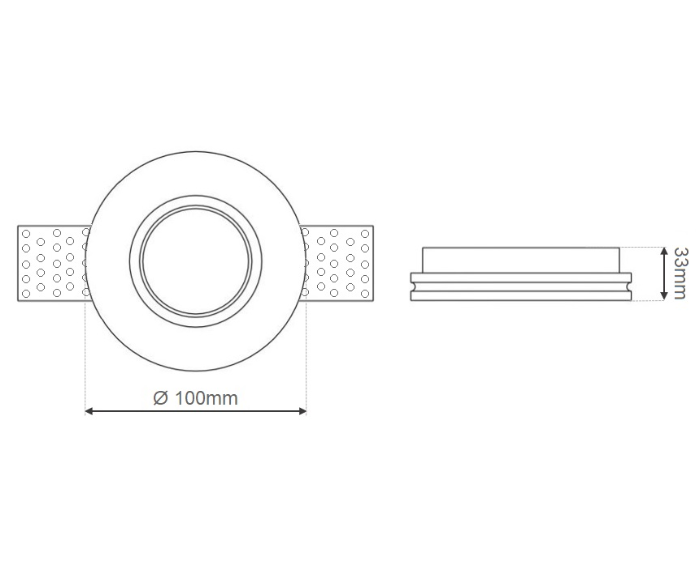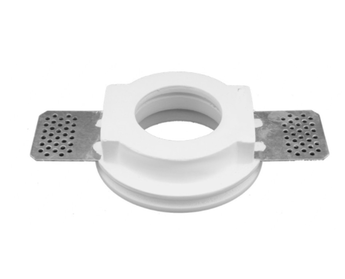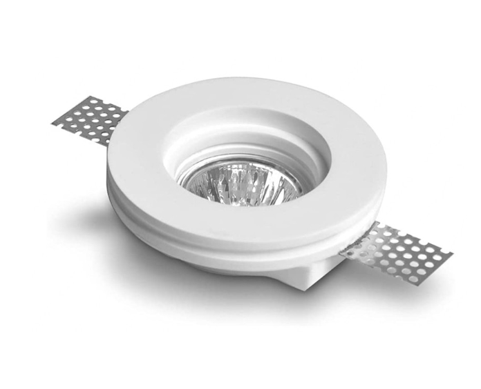 Supporto Rotondo da incasso per faretti. Realizzato in Gesso di colore Bianco. Portafaretto da interno adatto ad essere inserito in controsoffitti, con la possibilità di essere verniciato ed ottenereun effetto a scomparsa. Compatibile con tutti i tipi di lampade con Ø 50mm (standard faretti GU10, GU5.3, MR16).