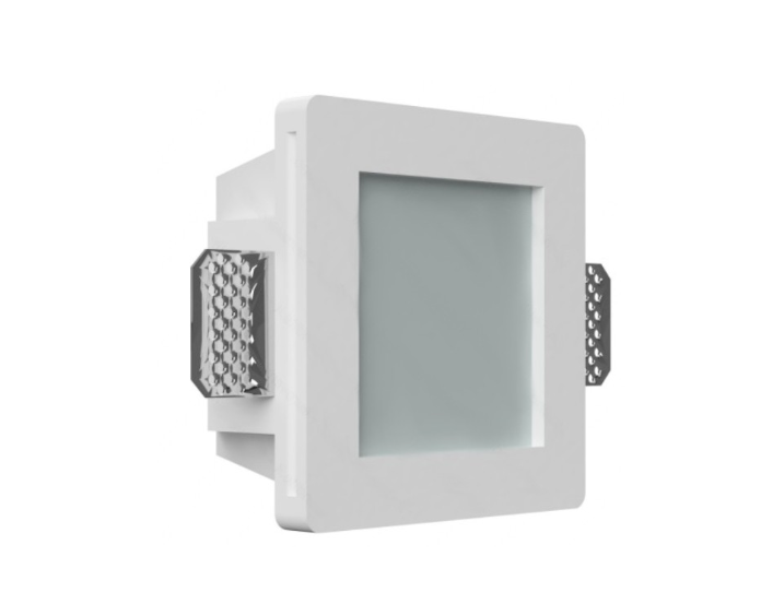 Supporto Quadrato da incasso per faretti. Realizzato in Gesso di colore Bianco con copertura in vetro satinato. Portafaretto adatto ad essere inserito in controsoffitti, con la possibilità di essere verniciato ed ottenere un effetto a scomparsa. Compatibile con tutti i tipi di lampade con Ø 50mm (standard faretti GU10 o GU5.3).