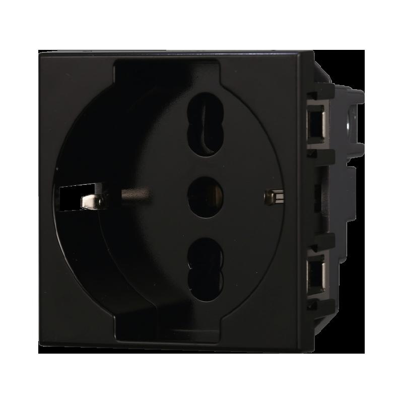 Presa schuko 2P+T 10/16A 250V serie Moon Ettroit compatibile Bticino Axolute colore nero. Interasse 19 mm e 26 mm in configurazione bipasso - alveoli protetti. La presa elettrica Schuko, detta anche presa tedesca, permette di inserire al suo interno qualsiasi spina (piccola,grande e schuko).