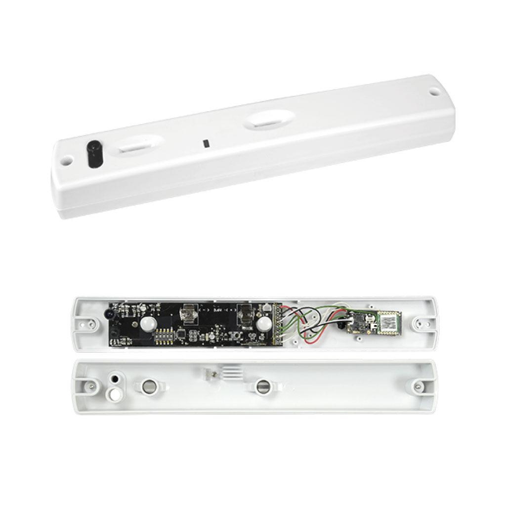 Sopras Rilevatore per esterni tipo tenda a basso consumo Bidirezionale Doppio PIR tipo tenda con antimasking Rilevamento: Range 3 m / 35º Indicatore di rilevamento del movimento Tamper anti-apertura Distanza spazio libero 1200 m Alimentazione 1 batteria ER14505 3.6 V Uso esterno Grado di protezione IP54 Comprende supporto Colore bianco Include trasmettitore Ajax per la comunicazione wireless con i pannelli Ajax