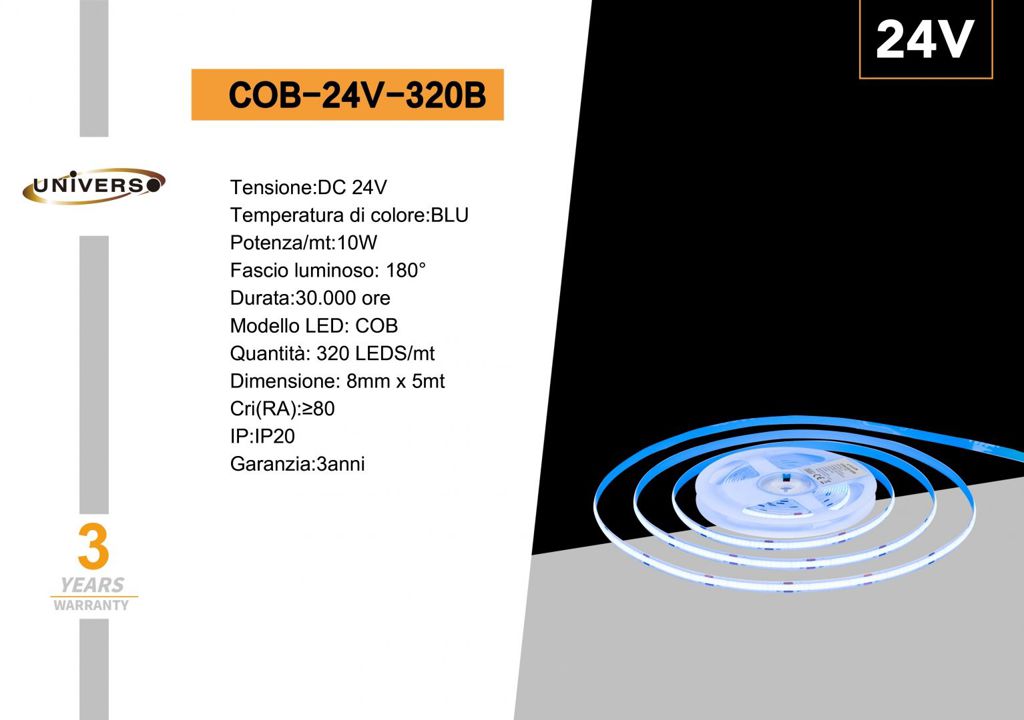 SPECIFICHE TECNICHE • Lunghezza: 5 metri • Potenza totale: 50 W • Potenza al metro: 10 W • Fascio luminoso: 180° •Numero di led: 320led/mt • Numero di led totale: 1600 led • Voltaggio: 24V DC • Tecnologia: LED COB • CRI = 80