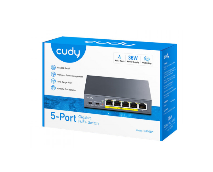 Switch PoE desktop o da parete con alimentatore da 36W e sistema di raffreddamento silenzioso 5 porte Gigabit RJ45, di cui 4 PoE; Potenza massima su una singola porta PoE: 30 W Gestione intelligente dell'alimentazione (PoE): disconnette automaticamente l'ultimo dispositivo alimentato quando l'alimentazione supera il budget MAC Address 2K; Capacità di commutazione massima: 10 Gbps; Velocità di inoltro massima: 7,44 Mpps; Jumbo Frame: 15 KB Dimensioni: 119 x 85 x 28 mm; Colore: nero