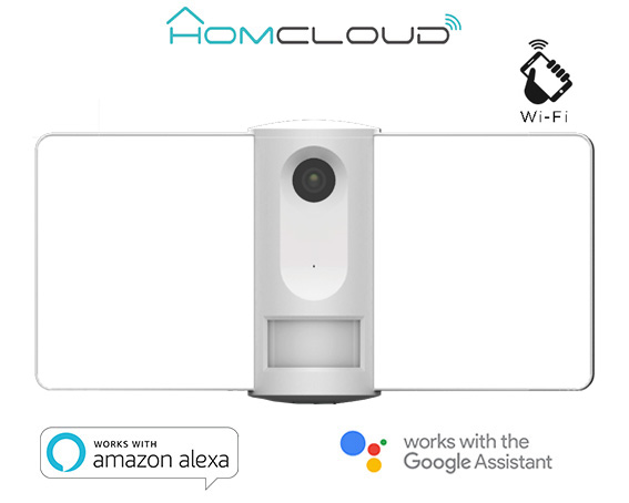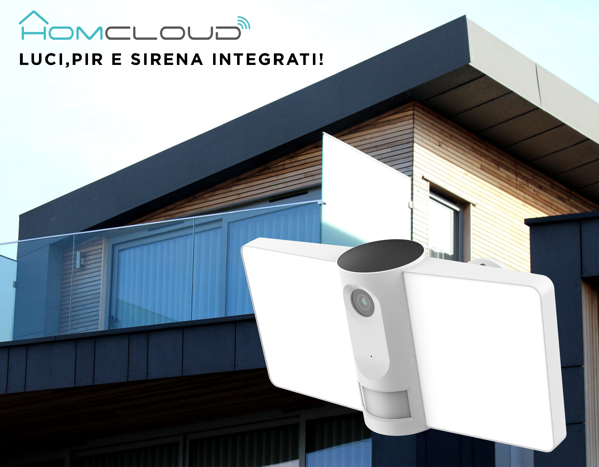 Attivazione a distanza: Sempre tutto sotto controllo, ovunque tu sia. Audio Bidirezionale: dialoga con chi sta di fronte alla telecamera Visione Notturna: In automatico, nitida e luminosa Condivisione: Scegli con quali membri della famiglia condividere il dispositivo prescelto. Configurazione rapida: Dopo averlo connesso all'elettricità e al campanello cablato(richiedi l'aiuto di un professionista), per connettere il videocampanello allo smartphone servono meno di 2 minuti Sirena integrata Faretti luminosi di sicurezza La telecamera Flight 1S Homcloud ti permette di monitorare in totale sicurezza e in tempo reale giardino di casa, esterno di magazzini, corti esterne e parcheggi. E' dotata di due faretti da 1000Lm ciascuno attivabili con rilevazione movimento tramite sensore PIR volumetrico o da interruttore su smartphone (o timer).
