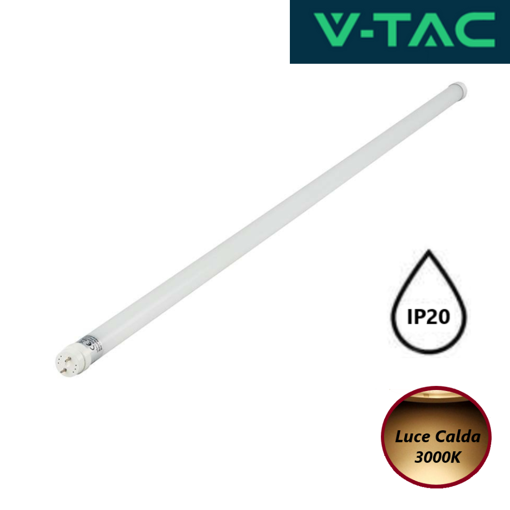 Tipo di attacco: T8 Base: G13 Dimensioni Tubo: 150CM Produttore chip LED e tecnologia: Epistar SMD Voltaggio: AC220-240 V AC, 50Hz Potenza: 20W Potenza (equivalente ad incandescenza): ~ 58W Colore della luce: Bianco caldo (3000K) Flusso luminoso: 2.100Lm - 105LM/W Apertura fascio luminoso: 160° Indice di resa cromatica (IRC): >80 Corpo Materiale: Nano-Plastic - copertura satinata (smerigliato) opaca Classe di protezione: IP20 Classe energetica: F Vita media: 20.000h Dimmerabilità: NO Orientabile: NO CRI> 80 PF > 0.5